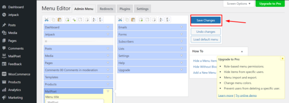 Step 6: Once you have made changes to the admin area menu, don't forget to click the Save Changes button at the bottom of the page to save your settings..