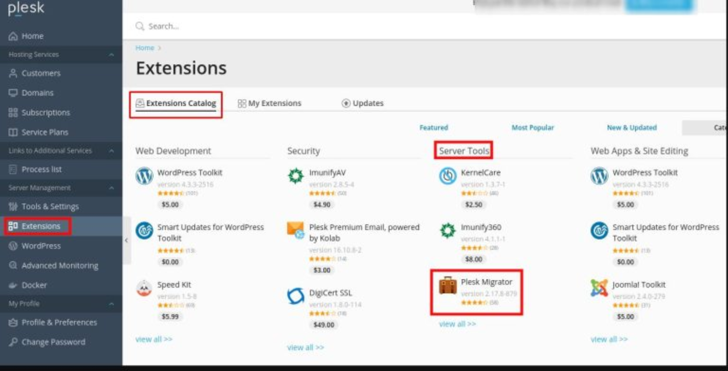 2. If the plesk server you have has not installed Plesk Migrator, please install Plesk Migrator via the Extensions menu > Extensions Catalog > Server Tools > search for Plesk Migrator then click install.