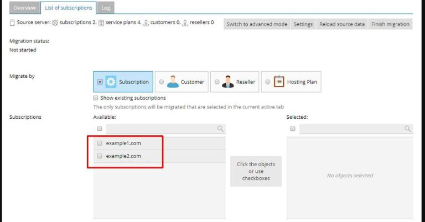 6. After the Prepare migration process is successful, you can choose the hosting account you want to migrate by checking the list of domains in the Subscription section.