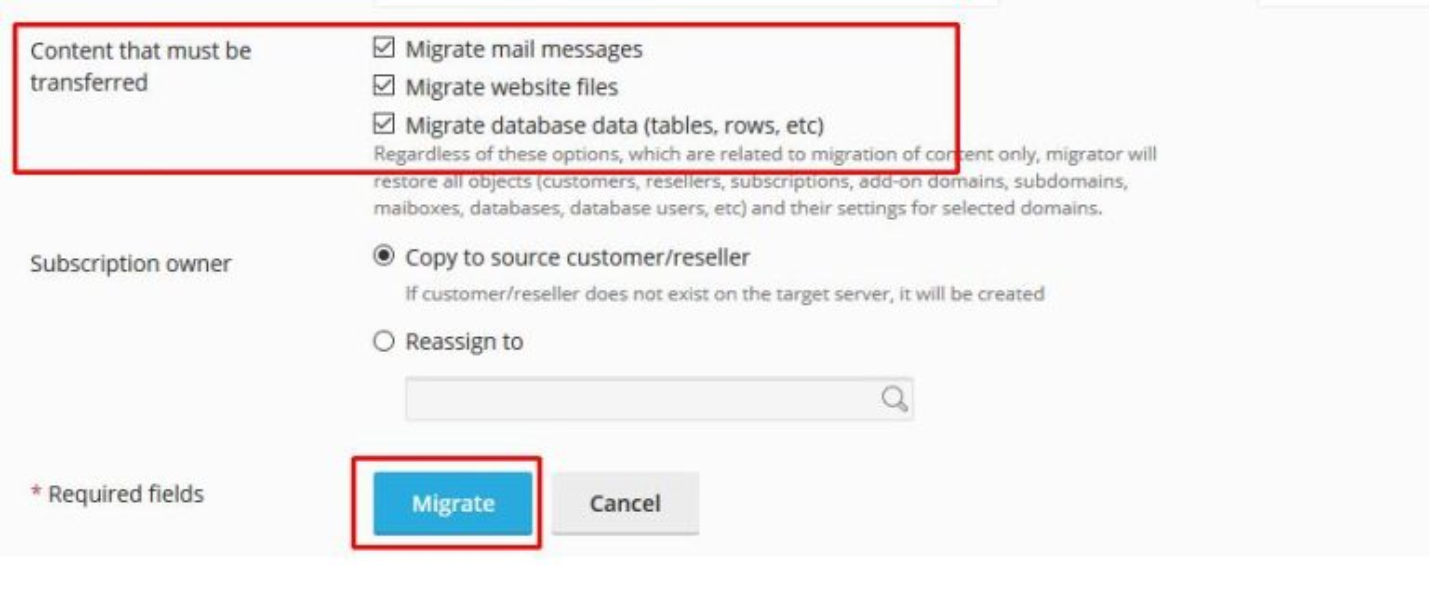 7. After checking the list of hosting accounts that you want to migrate, please check all again in the Content that must be transferred section then click Migrate.