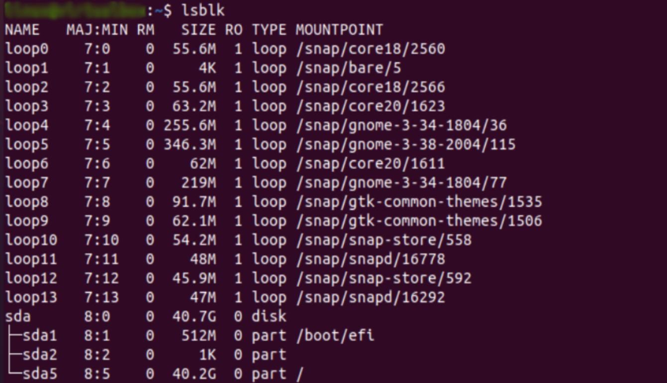 Before resizing partitions, we should have an overview of all the disks or devices in our Linux system. To check partitions, Linux provides the "lsblk" instruction. After running it, we have all the devices listed on the terminal screen. Our virtual drive "sda" is listed below in the list with a size of 40GB. In addition, it has 2 partitions. The sd1 partition is the root directory while the other is the main drive.