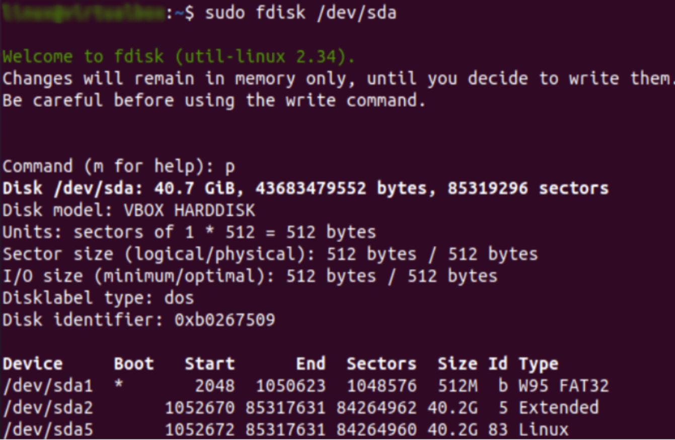 After executing these instructions, you will enter an interface where you can make adjustments to sda. Write "p" to get drive information such as its model, total units in bytes, sector size, input/output parsing size, label type i.e., des, and identification number along with information about its partitions. You can see the total amount of memory assigned to each partition and the partition type along with some sector IDs and data.