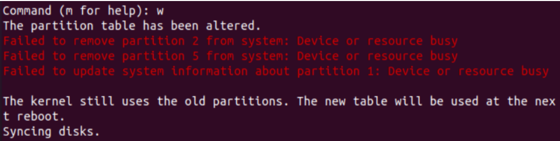 Saatnya menulis perubahan. Untuk itu, Anda harus menggunakan instruksi “w” pada antarmuka sda yang sama dan tabel partisi Anda akan berhasil diubah. Disk kemudian akan disinkronkan bersama.