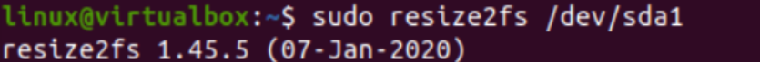 It's time to use the resize2fs instruction to resize your sda1 device according to the new partition we have created. For this, use the "resize2fs" instruction along with the path "/dev/sda1" in the Linux terminal as shown. After using this instruction, your sda1 partition will be resized.