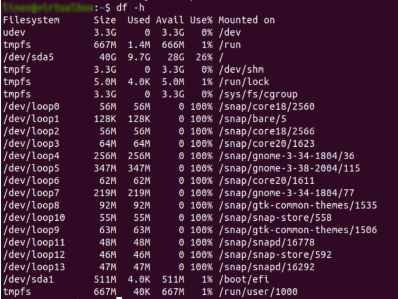 The use of the "df" instruction with the "-h" option shows us that the sda1 partition has been resized automatically.