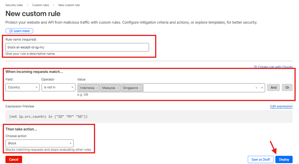 When incoming requests match: 1. Field = Country 2. Operator = is not in 3.