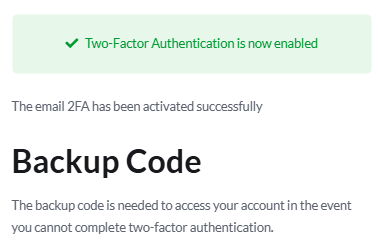 Once you got the code, then enter it and you will received confirmation notice and backup code. Please do backup the backup code into your own document.