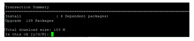 Pada Server Centos 7 perintah yum update dan yum upgrade akan memiliki fungsi sama, yaitu memperbarui ke versi terbaru dari paket. Tetapi perbedaanya adalah yum upgrade akan menghapus paket-paket yang lama. Sedangkan yum update akan mempertahankan paket-paket yang ada. Di tutorial ini kami menggunakan yum update karena kami ingin mempertahankan paket paket yang ada sebelumnya. Masukkan perintah berikut ini.