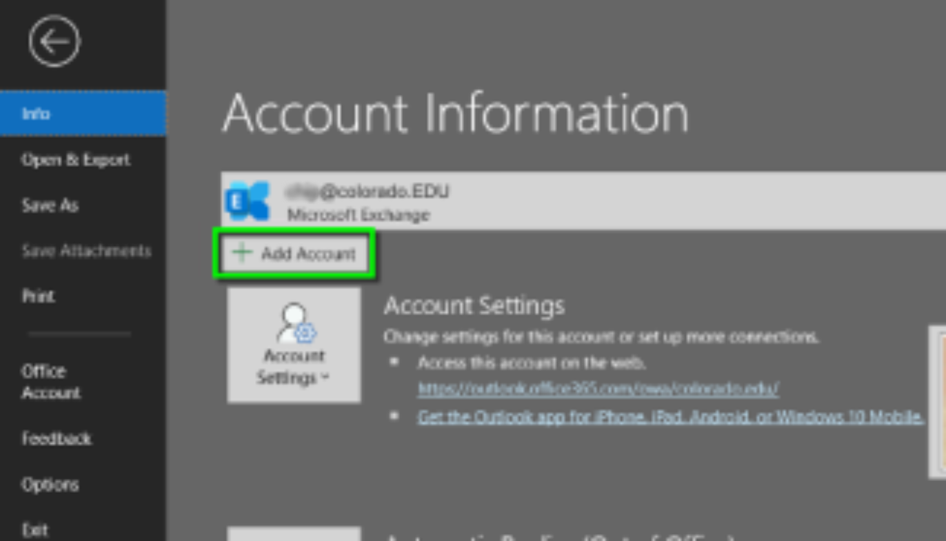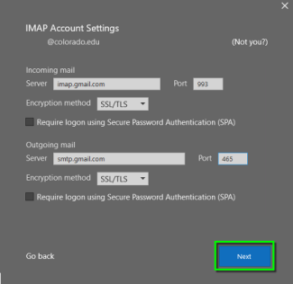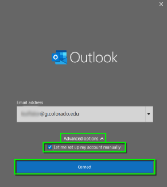 Masukkan IdentiKeyUsername@g.colorado.edu di kolom email (bukan first.last@colorado.edu). Klik Opsi lanjutan , pilih Biarkan saya mengatur akun saya secara manual , lalu klik Hubungkan .
