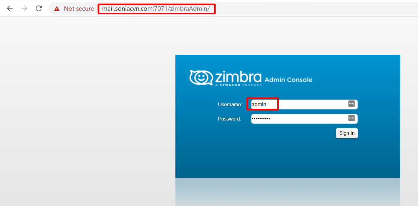 Pertama yang harus anda lakukan adalah login terlebih dahulu ke halaman administrator atau panel Zimbra melalui contoh, (https://(ip atau nama domain/hostname):7071, kemudian masukkan username default admin dan password sesuai yang anda isikan ketika install Xcube Zimbra.