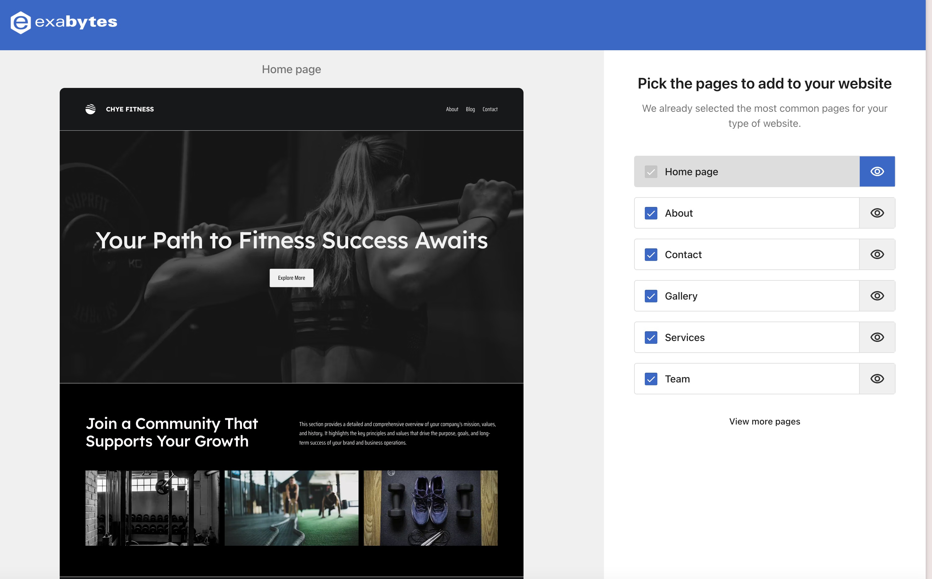 5. Setelah memilih template, pengguna akan diminta untuk memilih halaman yang diperlukan untuk situs mereka (opsi ini akan dilewati jika pengguna memilih tata letak satu halaman).