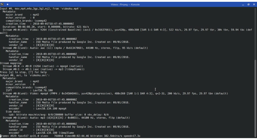 Sebagai contoh, Anda ingin melakukan konversi file video berformat mp4 menjadi avi, maka perintahnya menjadi sebagai berikut: