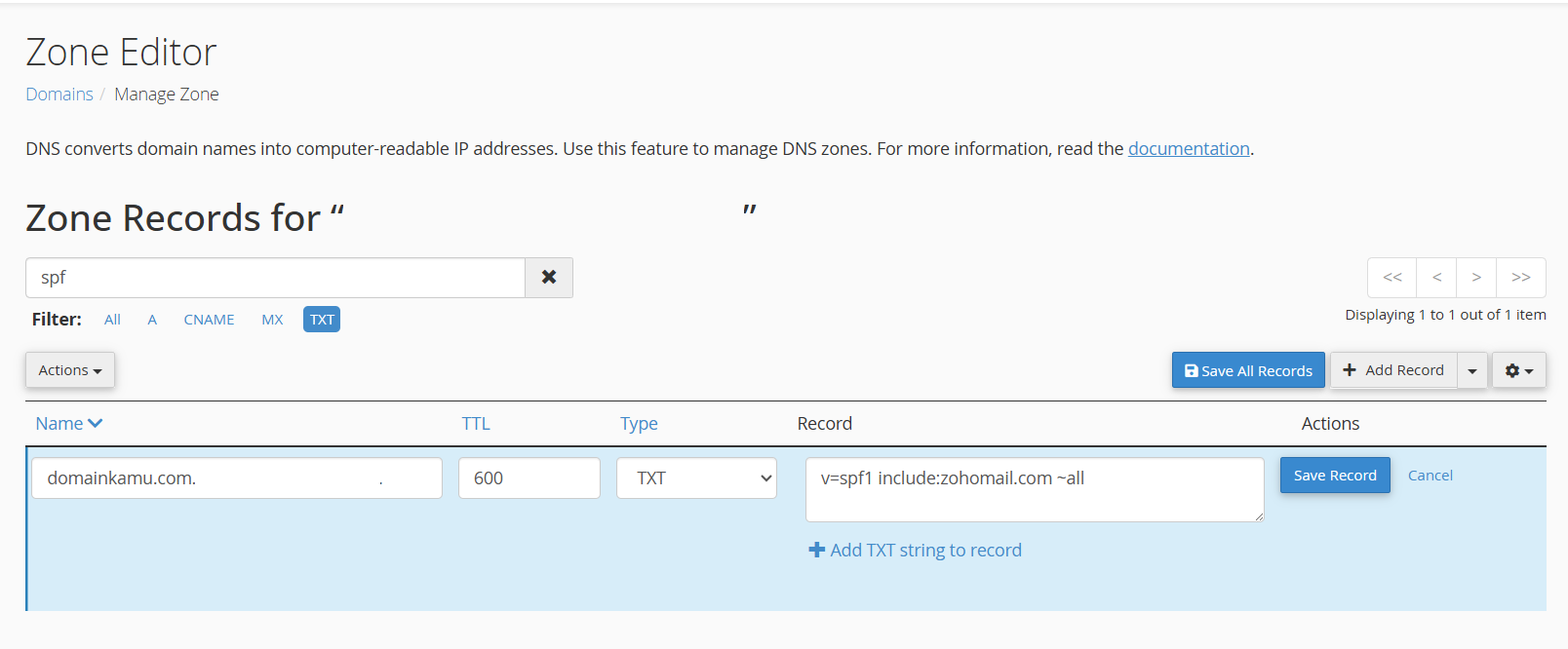 Nama domain utama | Default | TXT | v=spf1 include:zohomail.com ~all |