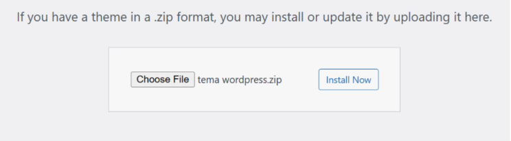 - Klik 'Choose File' untuk upload file theme yang sudah Anda download. Pastikan file formatnya '.zip'.