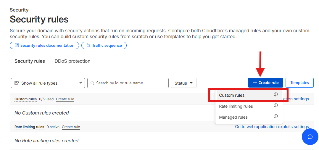 Laman Security Rules akan terbuka, silahkan klik pada menu "Create Rule" lalu pilih "Custom Rules"