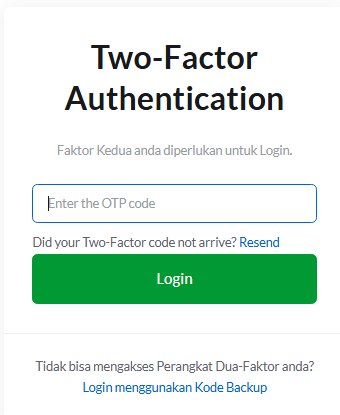 Pertama, jika kehilangan pemulihan autentikasi maka bisa login menggunakan kode backup. Kode backup disediakan ketika Anda selesai melakukan setup 2FA pada akun Anda. Kode ini dirancang sebagai alternatif ketika kehilangan fungsi utama dari 2FA. Jika Anda menyimpan kode backup tersebut, maka bisa langsung digunakan.